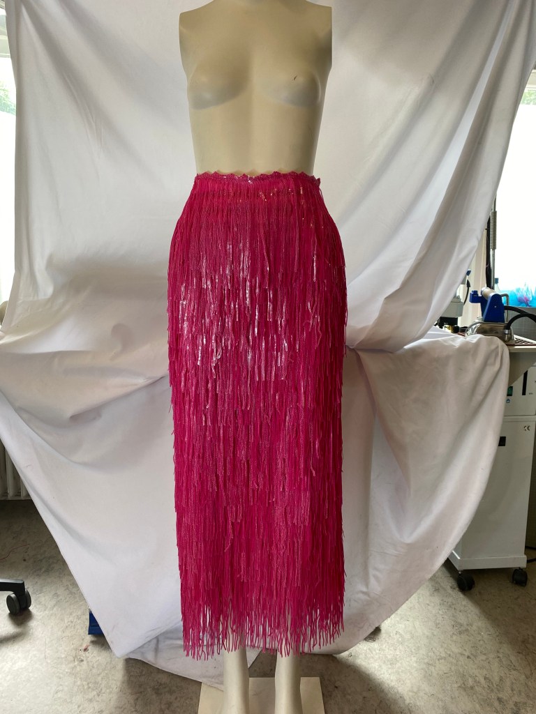 One of the main projects I worked on was making three sequin fringe skirts from start to finish. I corrected the base patterns for the characteristics of the desired skirt and cut the tulle. They were then basted together and basted with the fringe strips. After that, I sewed the pieces by machine. Later on, I also had the chance to grade and customize the pattern for a client’s order.