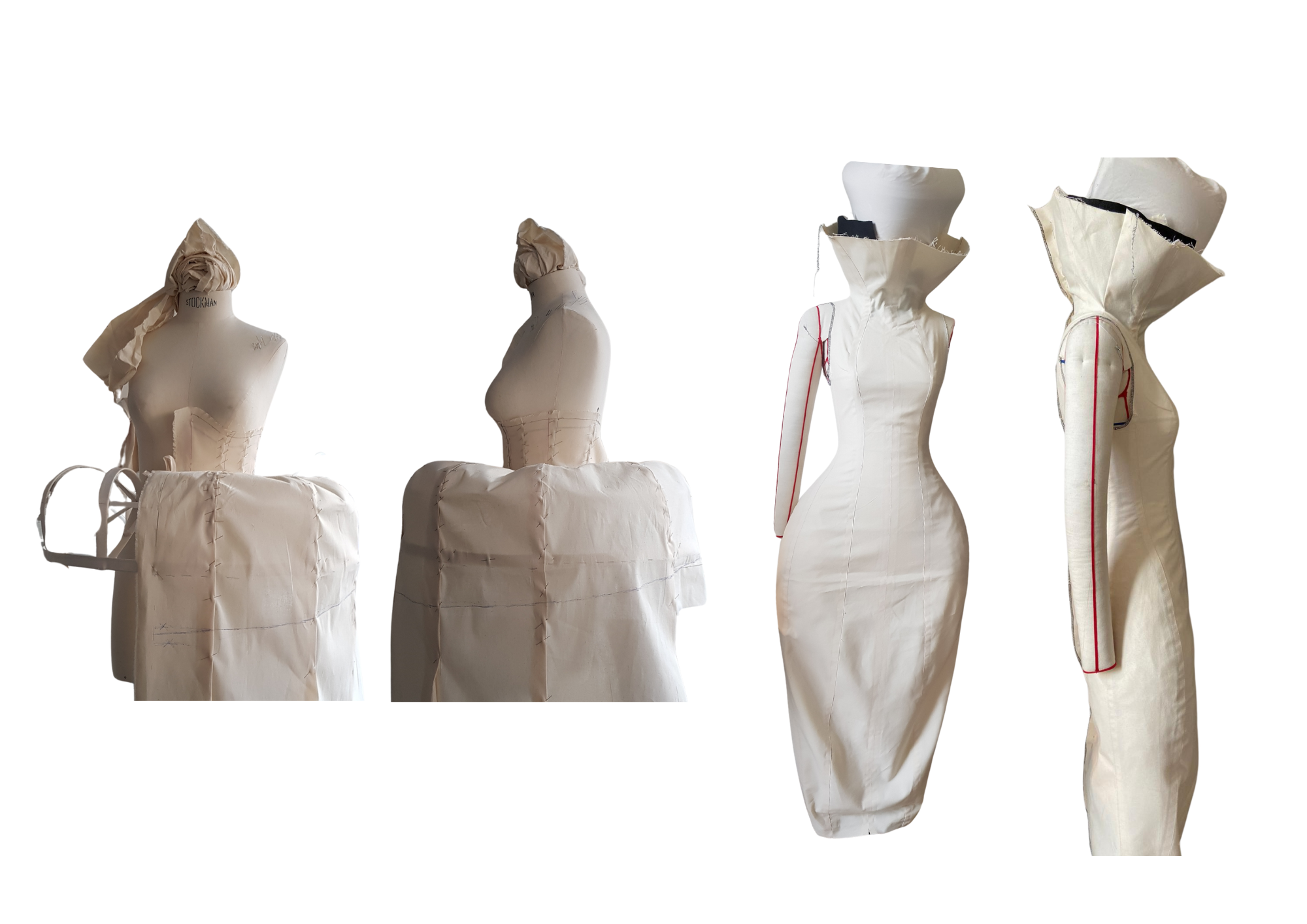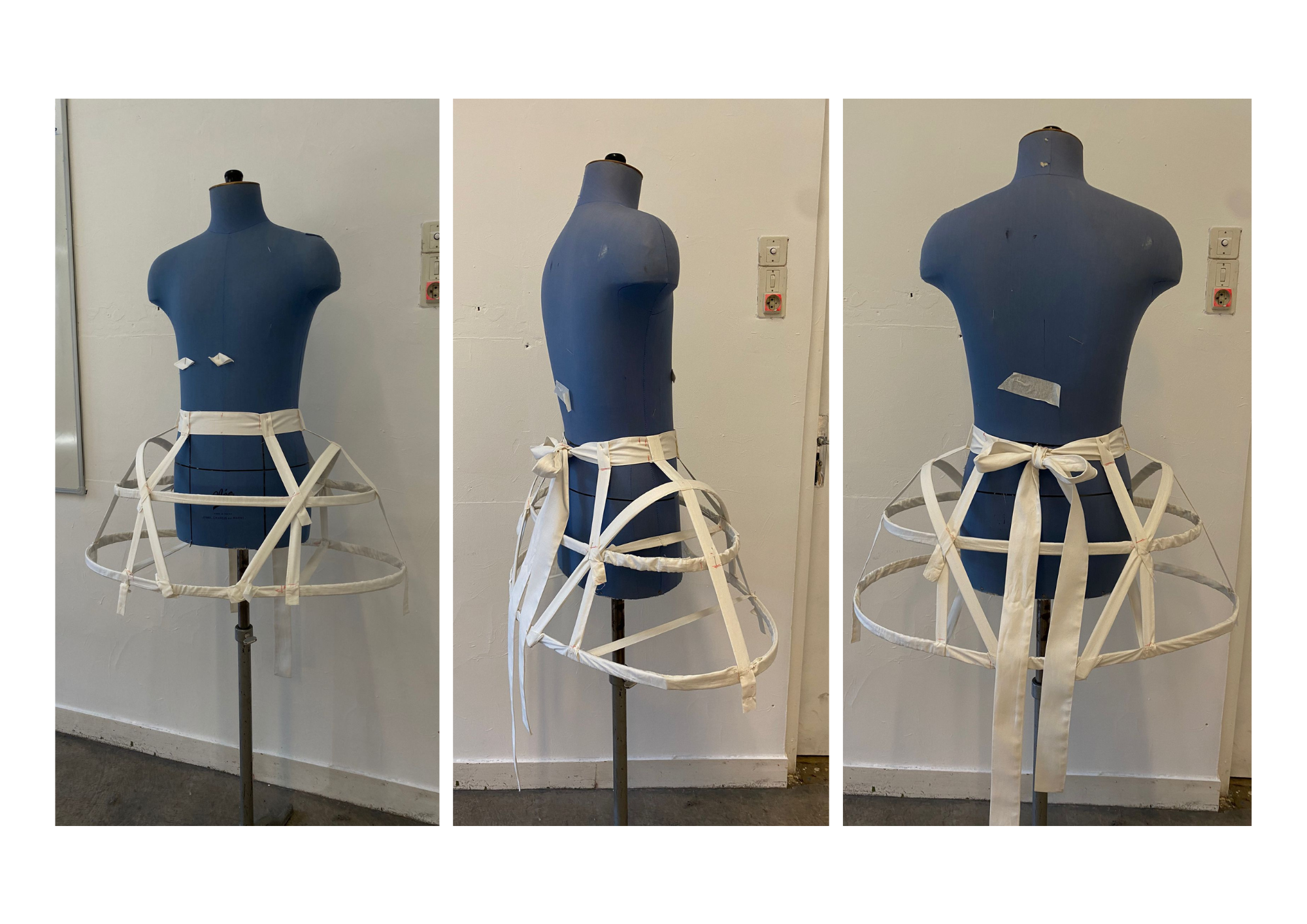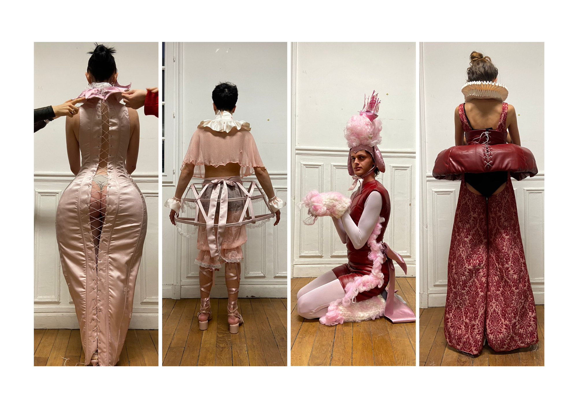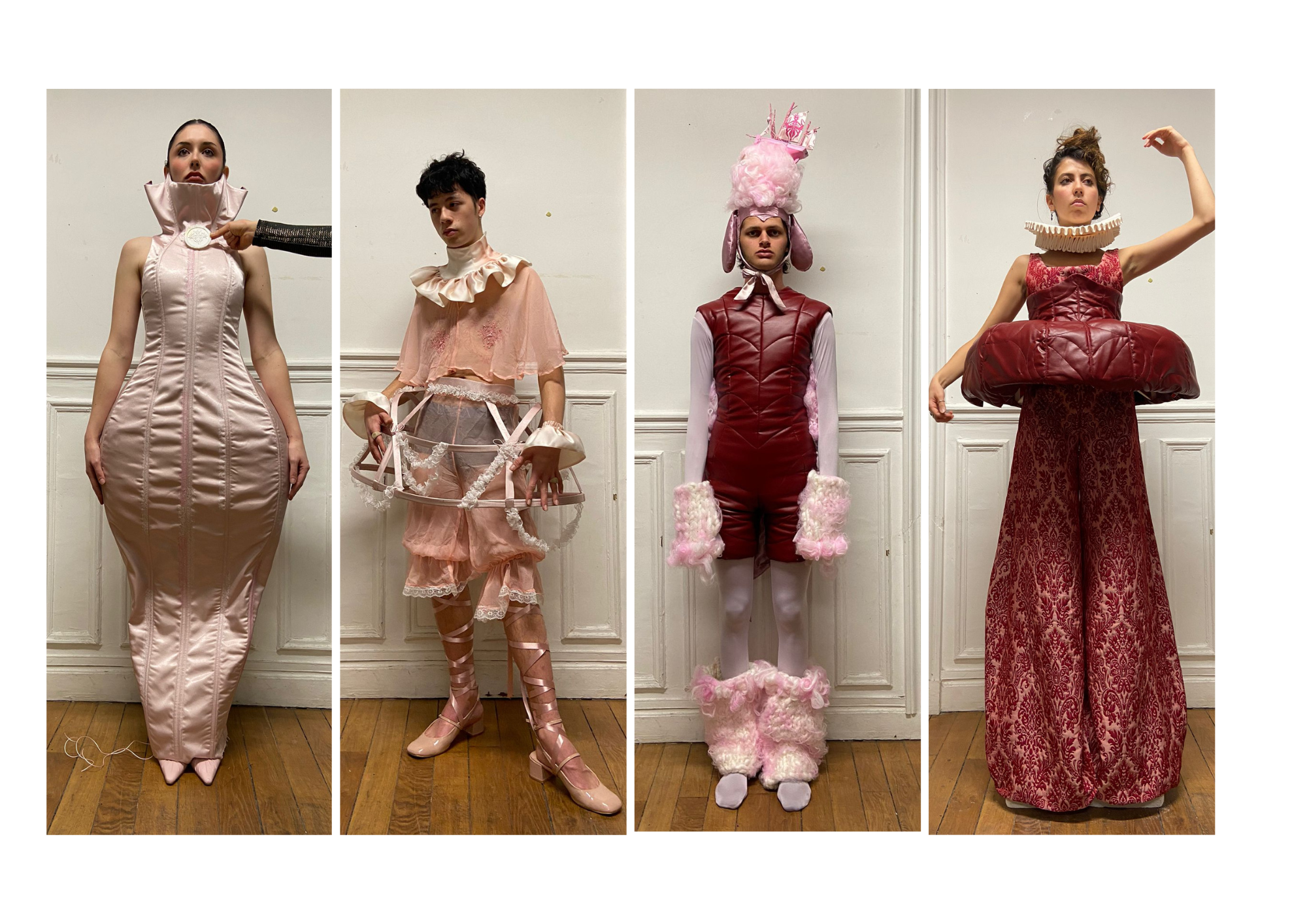 The project explores the concept of ‘creating a painting’ by blending social critique with historical inspirations. Through a satirical family staging, it denounces a society where appearances reign, much like Instagram, which has become a modern museum of retouched images. Drawing inspiration from the opulence of Rococo style and the visual codes of contemporary figures such as the Kardashians, the costumes exaggerate body shapes to emphasize artificiality. The family consists of four characters: an imposing mother who takes the lead role, a corseted daughter, a distant and more transparent son, and a pet that belongs to the mother.