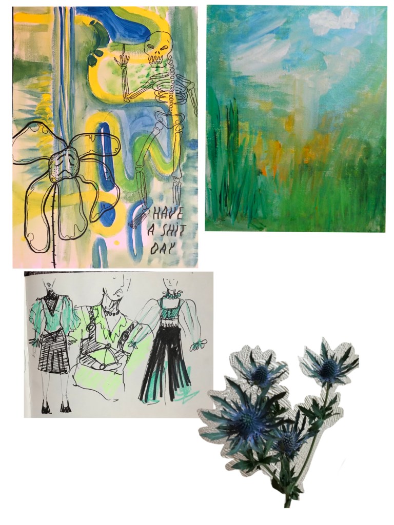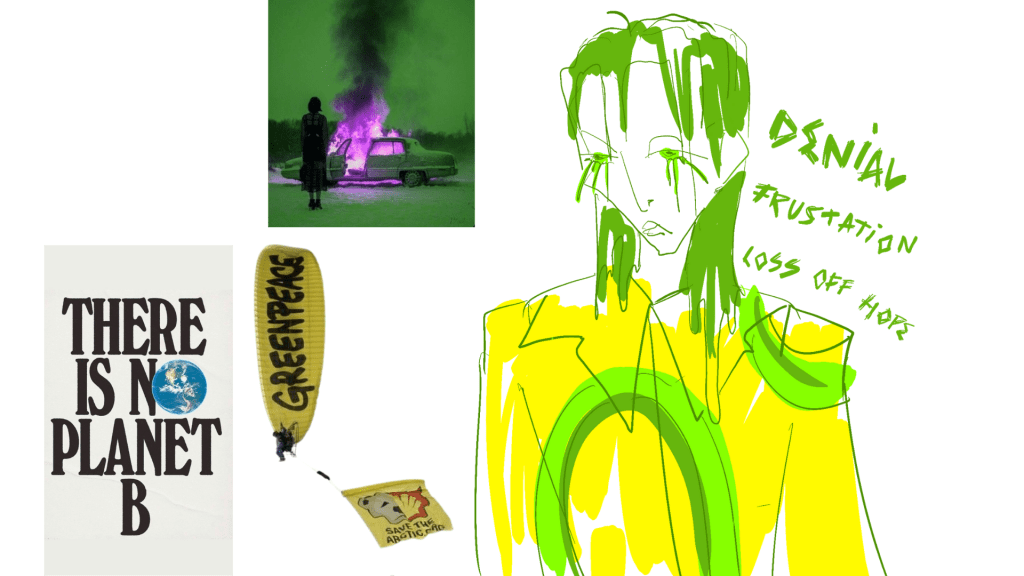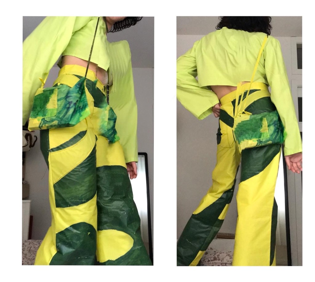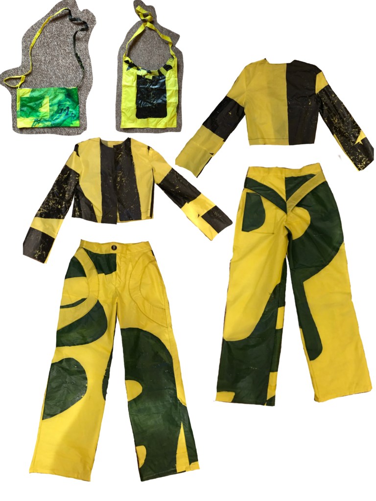YELLOW JACKET AND TROUSERS MADE FROM AN OLD GREENPEACE BANNER WITH PAINTINGS AND DESIGNS INSPIRED BY THE COLOUR PALETTE AND IDEAS.